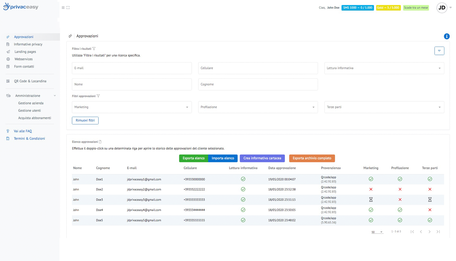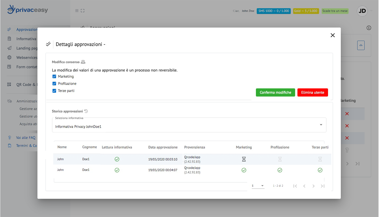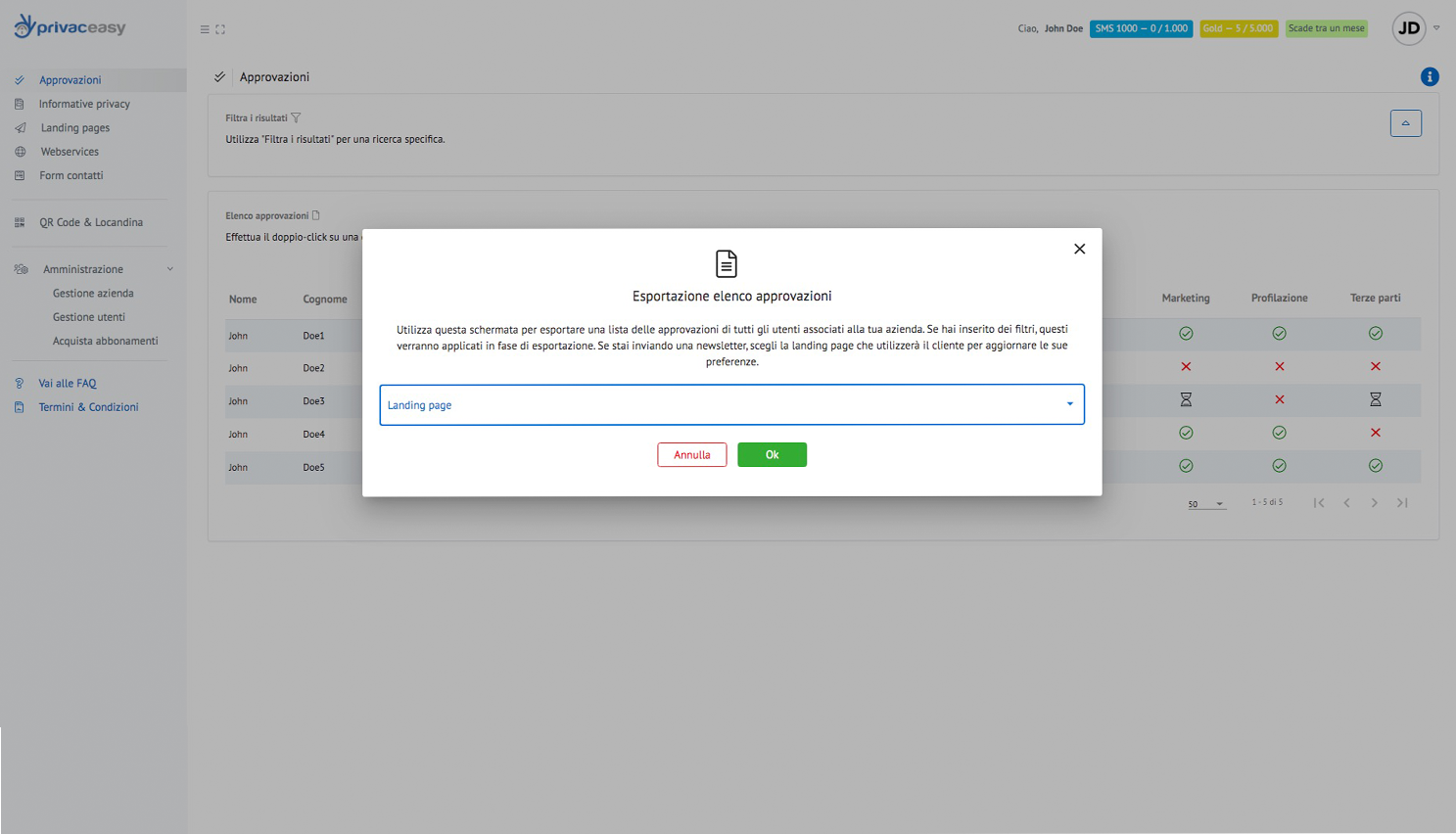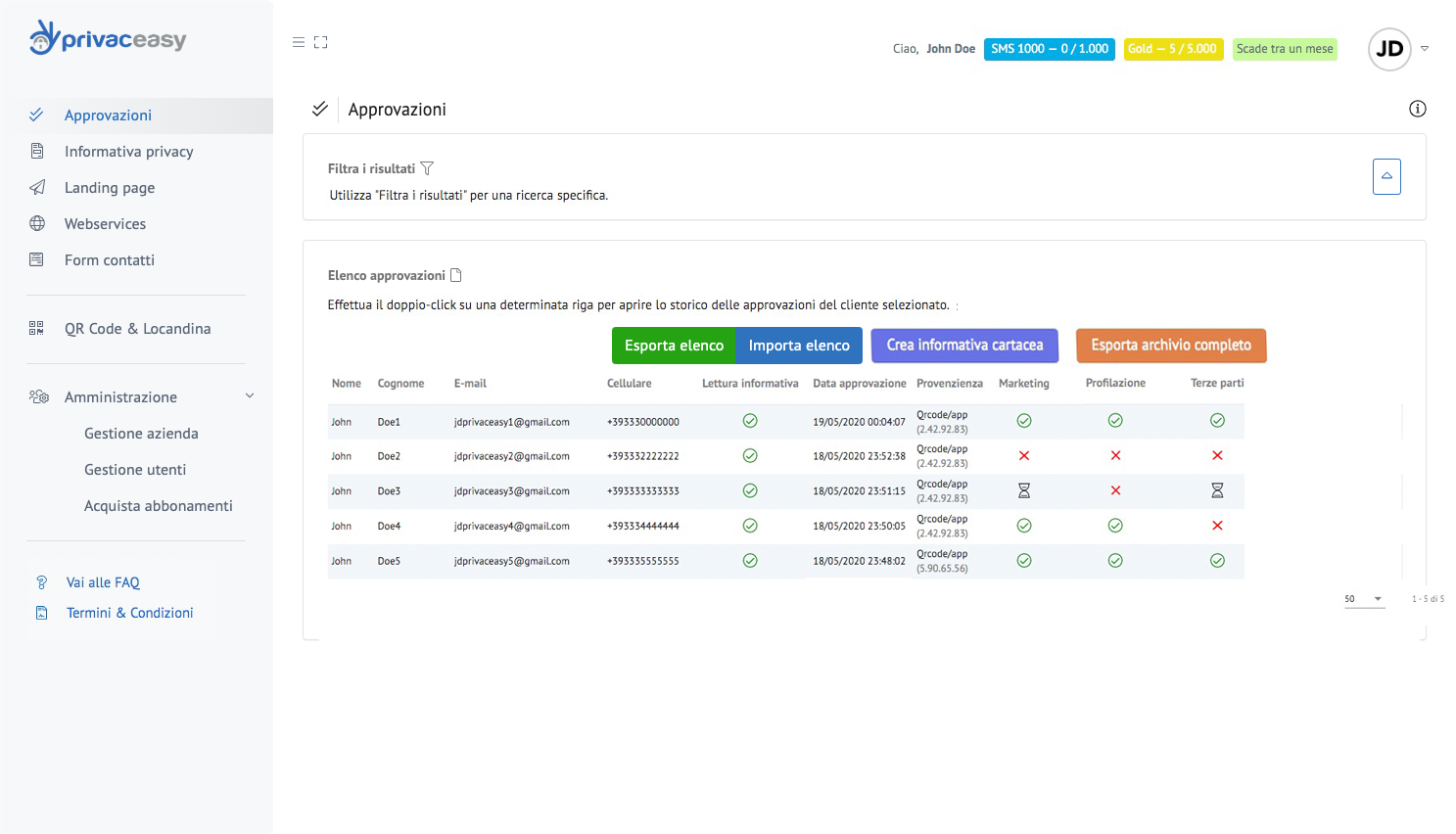 L’elenco delle approvazioni è il cuore di privaceasy: da qui potrete monitorare la situazione di ogni singolo contatto, verificare se ha preso visione della vostra informativa privacy e quali sono le sue preferenze in merito ai box approvazioni da voi impostati.
